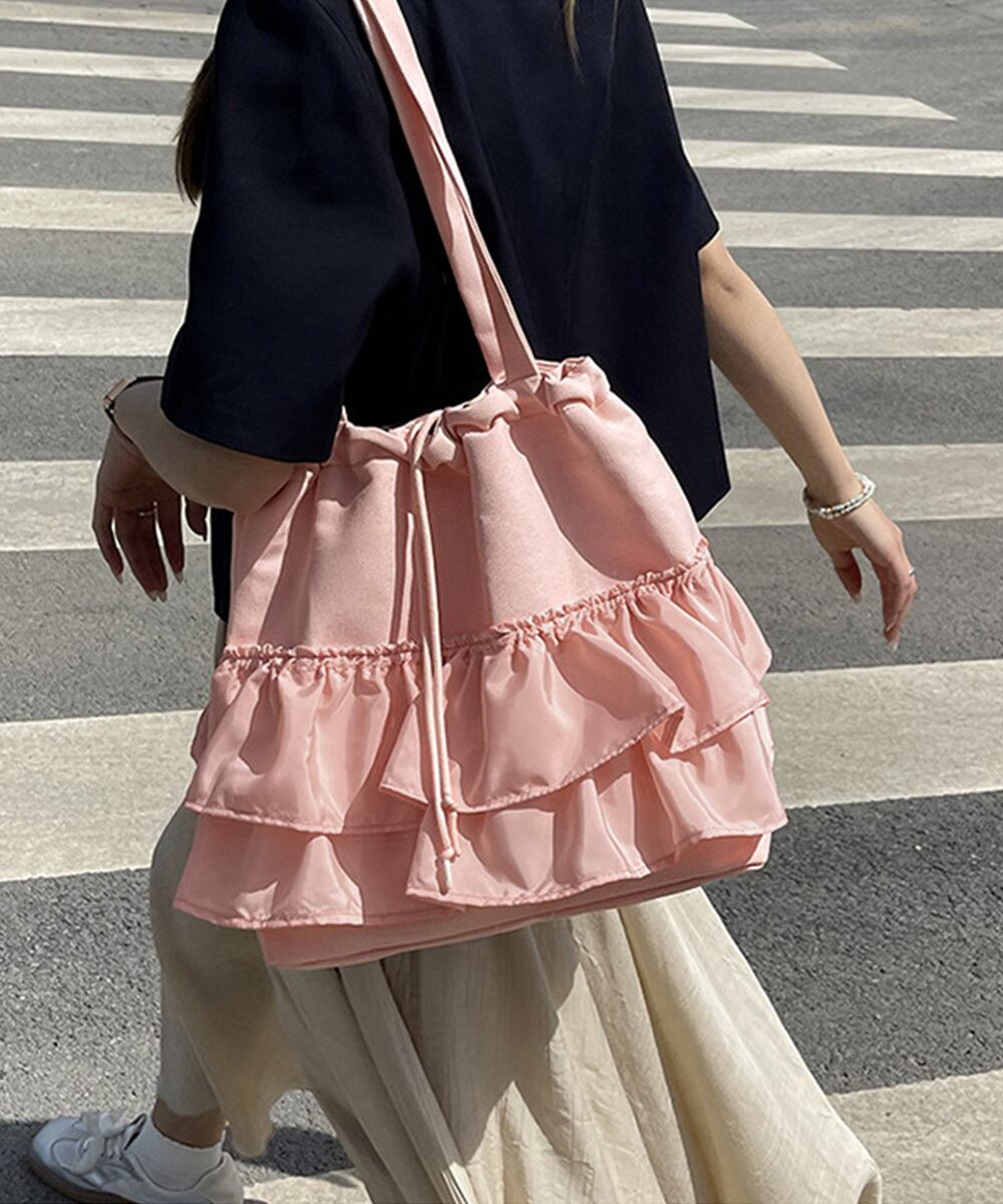 甘すぎないティアードフリルデザインがポイントの肩掛けバッグ。