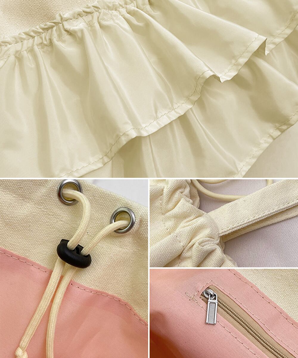 キャンバス素材の土台に艶感のあるポリエステルフリルを組み合わせた、絞ると巾着風にもなる2WAY仕様。