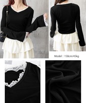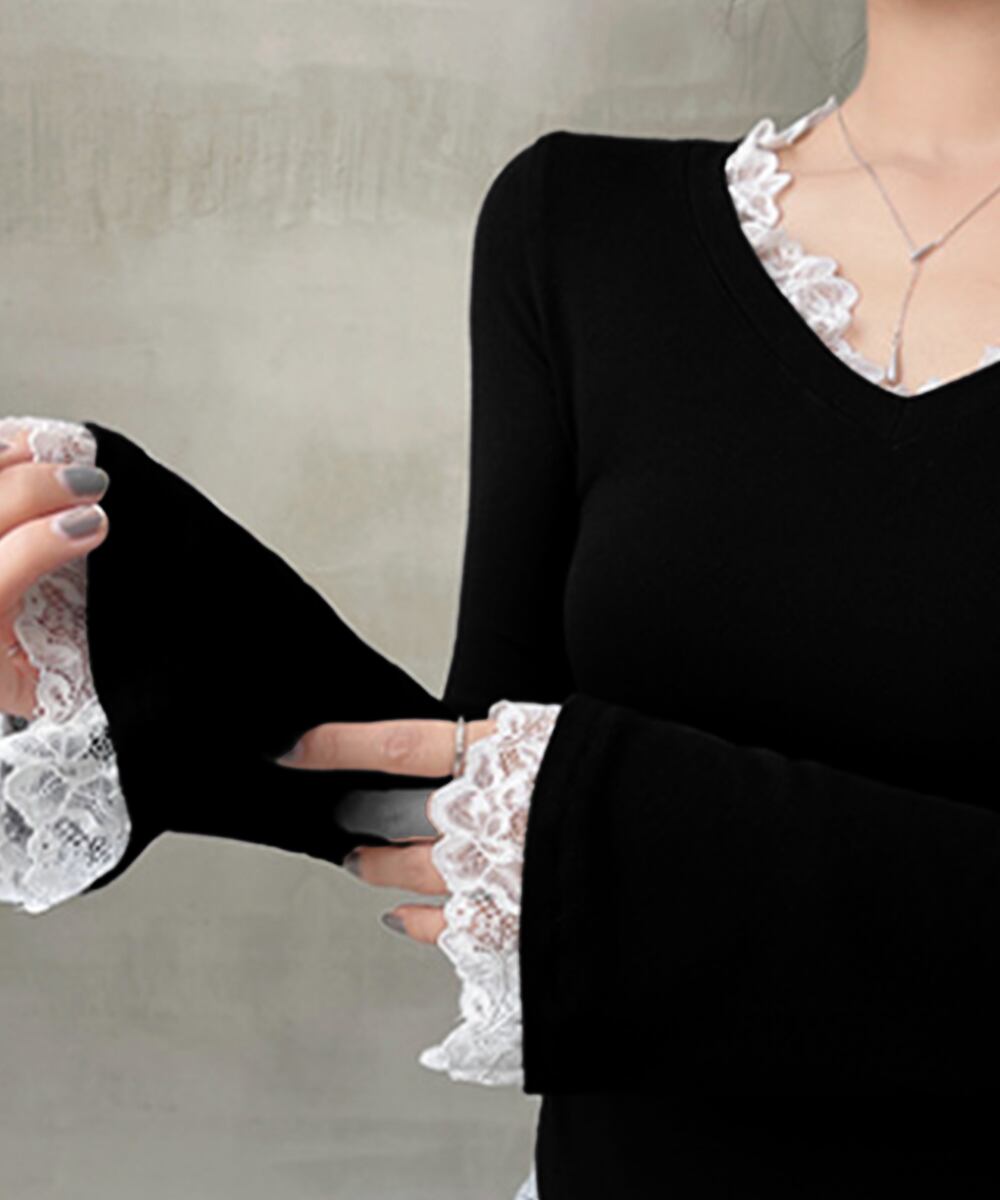 レース付 Tシャツ Vネック 長袖 リブトップス ブラック (SK-0601)