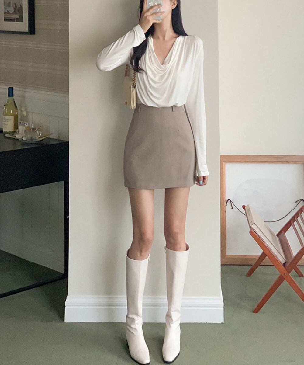 深めのドレープネックが、抜け感と大人の色気をプラス。
