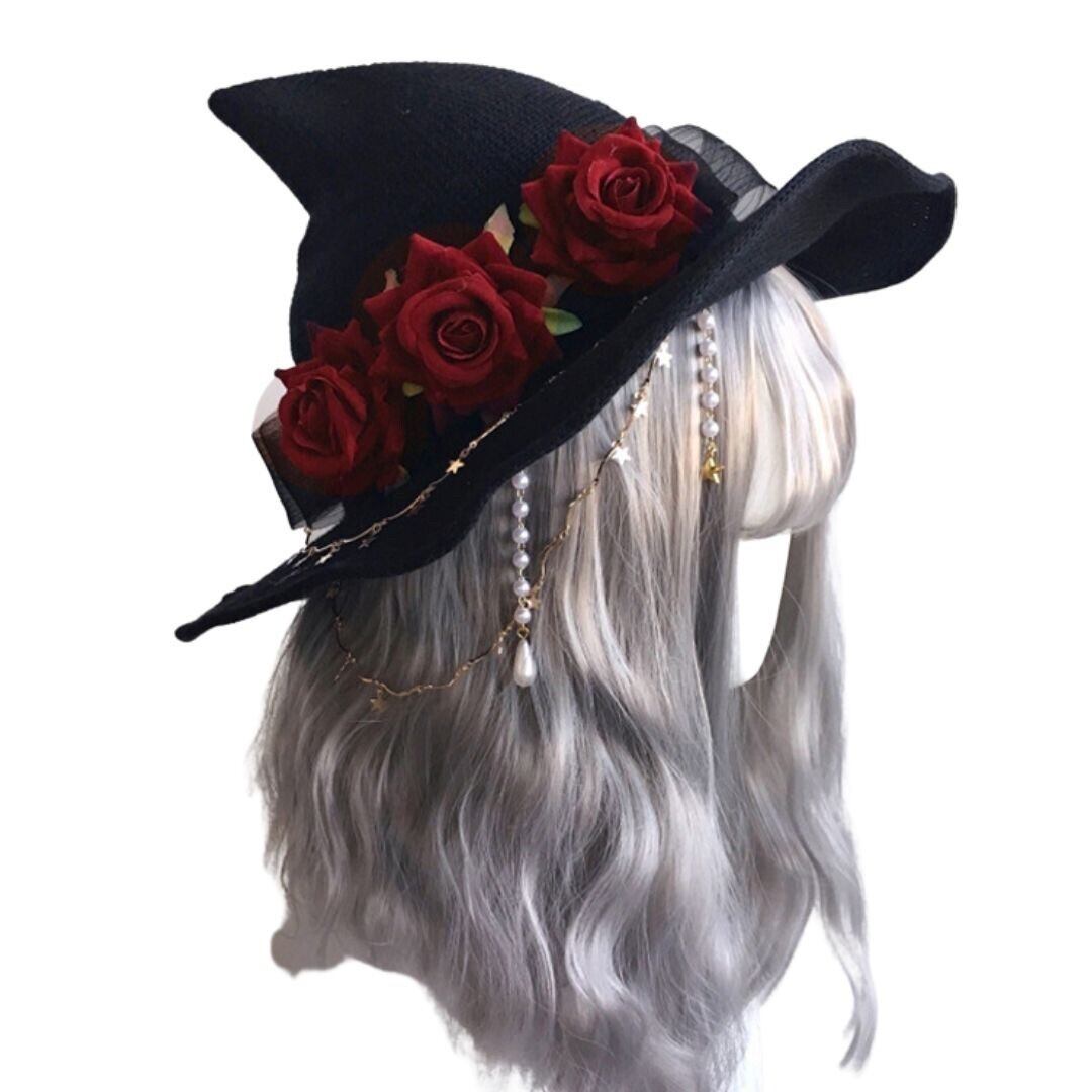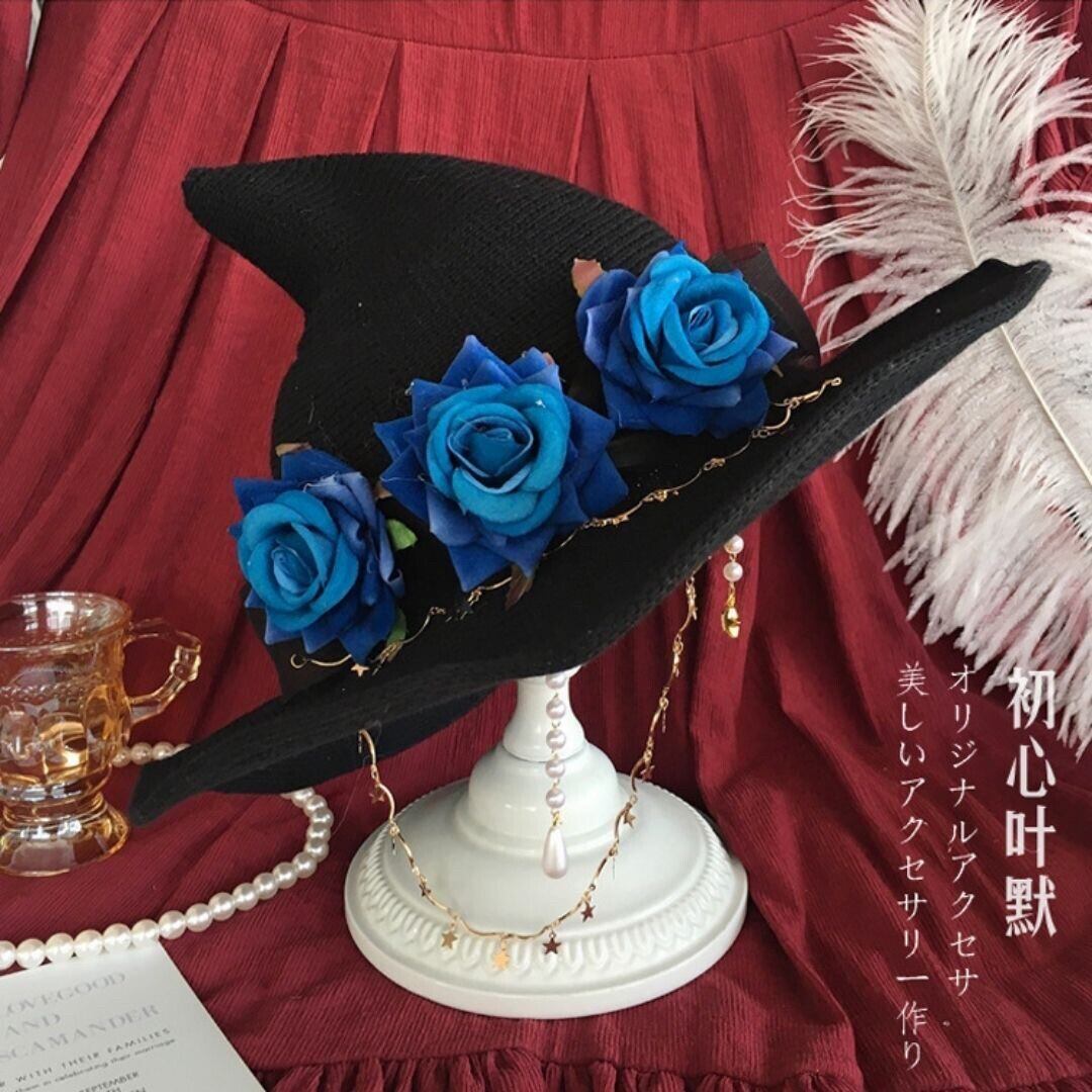 薔薇とアクセサリーをあしらった魔法使いのトンガリハットです。