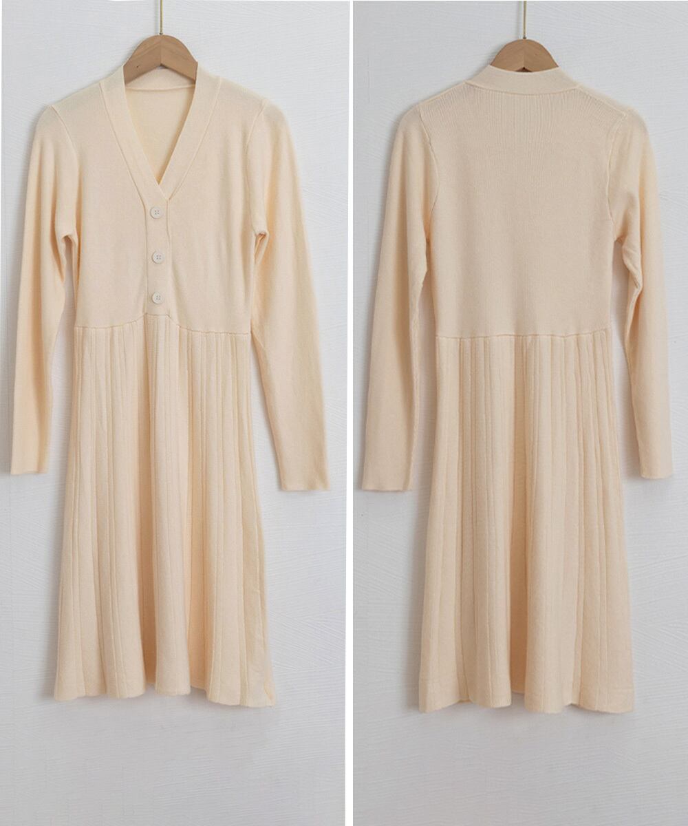 Vネック ニットワンピース 飾りボタン付き (SK-0768)
