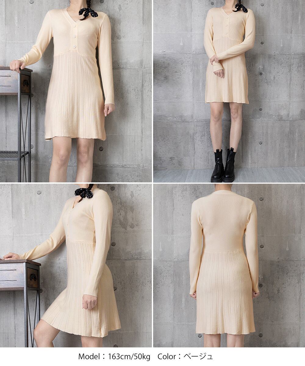 Vネックと胸元の飾りボタンがほどよいアクセントになるフレアニットワンピース。