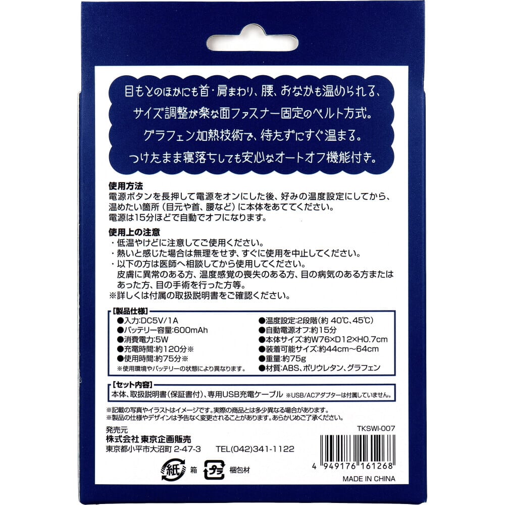 目もとのほかにも首・肩まわり、腰、おなかも温められる、サイズ調整が楽な面ファスナー固定のベルト方式。